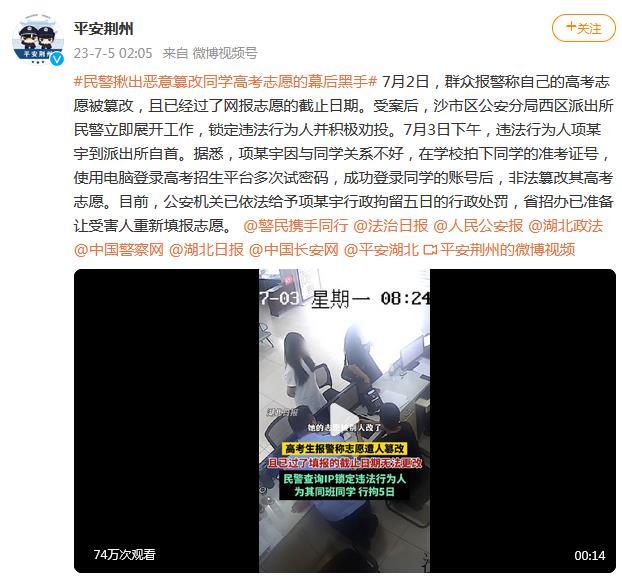 据湖北省荆州市公安局官方微博消息,7月2日,群众报警称自己的高考志愿被篡改,且已经过了网报志愿的截止日期。受案后,荆州市沙市区公安分局西区派出所民警立即展开工作,锁定违法行为人并积极劝投。7月3日下午,违法行为人项某宇到派出所自首。据悉,项某宇因与同学关系不好,在学校拍下同学的准考证号,使用电脑登录高考招生平台多次试密码,成功登录同学的账号后,非法篡改其高考志愿。目前,公安机关已依法给予项某宇行政拘留五日的行政处罚,湖北省招办已准备让受害人重新填报志愿。